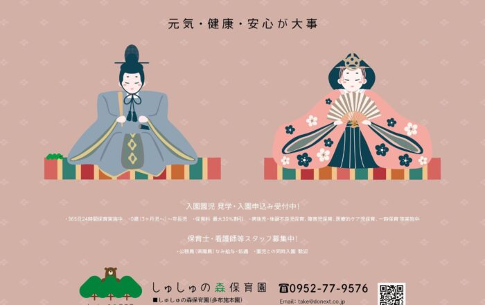 このようななか、2022年3月、佐賀市唐人町において、企業主導型保育園として、新たに「しゅしゅの森保育園Jr.ジュニア(唐人分園)」を新規開園し、多布施本園と連携して一体的に運営することとしました。